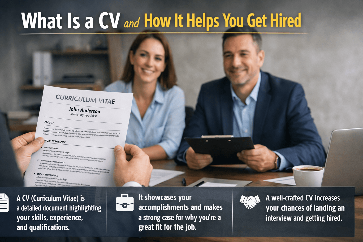 A CV is your professional document that summarizes experience, skills, and education to help employers decide whether to hire you.